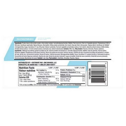 | Ingredients: Protein Blend (Whey Protein Isolate, Milk Protein Isolate), Isomaltooligosaccharides, Vegetable Glycerin, Maltitol, Palm Kernel Oil, Sunflower Seed Butter, Natural Flavours, Skim Milk Powder, Soy Lecithin, Sea Salt, Confectioner's Sprinkles (Sugar, Corn Starch, Oil Blend [palm Oil, Palm Kernel Oil], Edible Shellac, Fruit And Vegetable Concentrates (Colour), Soy Lecithin, Corn Dextrin, Carnauba Wax, Sodium Bicarbonate), Tapioca Starch, Distilled Monoglycerides, Calcium Carbonate, Sucralose. |
