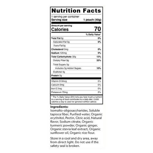 | Other Ingredients: Isomalto-oligosaccharides, Soluble tapioca fibre, Purified water, Organic erythritol, Pectin, Citric acid, Natural flavour, Sodium citrate, Organic turmeric powder, Organic ginger, Organic stevia leaf extract, Organic sunflower oil, Organic rice flour. | ||