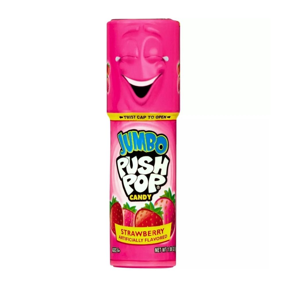 Push Pop jumbo push pop is a super-sized delicious and simple lollipop that is spring-loaded to deliver intense flavor action to your taste buds. Each one comes in a rugged plastic case that has a cap with a clip so you can easily bring it with you and enjoy anywhere or everywhere. Eat some now and save the rest for later wherever you go.