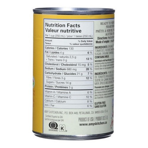 Amy's Organic Tomato Bisque is a delicious and convenient soup that offers a rich and creamy texture. Made with organic tomatoes and a blend of herbs and spices, this bisque is perfect for a quick meal or as a comforting side dish. Free from artificial flavors and preservatives, it is a wholesome option for those seeking a healthy diet. Enjoy it alone or paired with fresh bread for a satisfying meal.
