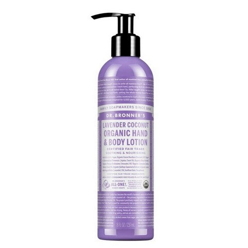 Experience the soothing blend of organic lavender and coconut in Dr. Bronner's Organic Hand and Body Lotion. This luxurious lotion is crafted with the finest organic ingredients to nourish and hydrate your skin, leaving it soft and fragrant. Perfectly suitable for all skin types, it absorbs quickly without feeling greasy. Embrace the calming aroma of lavender while enjoying the moisturizing properties of coconut oil, making it an exceptional addition to your daily skincare routine.