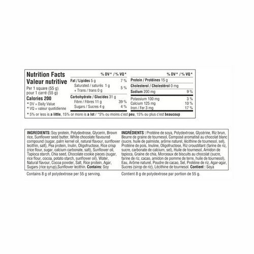 Other Ingredients: Soy protein, Polydextrose, Glycerin, Brown rice, Sunflower seed butter, White chocolate flavoured compound (sugar, palm kernel oil, natural flavour, sunflower lecithin, salt), Pea protein, Inulin, Oligofructose, Rice crisp (rice flour, sugar, calcium carbonate, salt), Sunflower oil, Tapioca starch, Chia seed, Chocolate cookie pieces (sugar, rice flour, cocoa, potato starch, sunflower oil), Water, Natural flavour, Cocoa powder, Salt, Rice protein, Agar,Sugars (rice syrup), Sunflower lecithin. Contains: Soy.