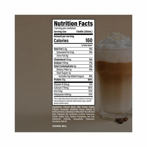 Other Ingredients: Filtered Water, Milk Protein Isolate, Calcium Caseinate, Alkalized Cocoa, Natural and Artificial Flavor, Colombian Coffee, MCT Oil, Cellulose Gum, Cellulose Gel, Sunflower Lecithin, Potassium Citrate, Gellan Gum, Sodium Phosphate, Sea Salt, Potassium Chloride, Acesulfame Potassium, Sucralose, and Reb-M. |
