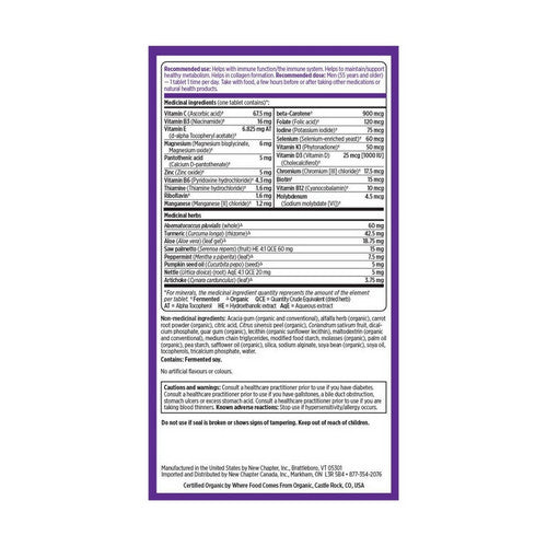 | Non-Medicinal Ingredients: Acacia gum (organic and conventional), alfalfa herb (organic), carrot root powder (organic), citric acid, Citrus sinensis peel (organic), dicalcium phosphate, guar gum (organic), lecithin (organic sunflower lecithin), maltodextrin (organic and conventional), medium chain triglycerides, modified food starch, palm oil (organic), pea starch, safflower oil (organic), silica, sodium alginate, soya bean (organic), soya oil, tocopherols, tricalcium phosphate, water. | |