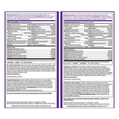 Non-Medicinal Ingredients: Acacia gum (organic and conventional), alfalfa herb (organic), carrot root powder (organic), citric acid, Citrus sinensis peel (organic), Coriandrum sativum fruit, dical- cium phosphate, guar gum (organic), lecithin (organic sunflower lecithin), maltodextrin (organic and conventional), medium chain triglycerides, modified food starch, molasses (organic), palm oil (organic), pea starch, safflower oil (organic), silica, sodium alginate, soya bean (organic), soya oil, tocopherols, tricalcium phosphate, water.