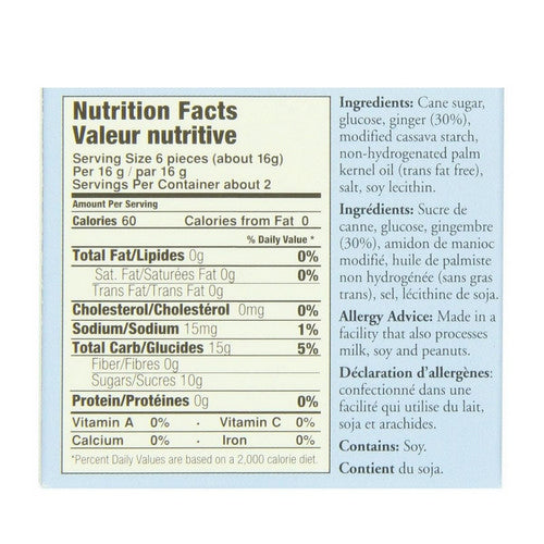 Ingredients: Cane sugar, glucose syrup, ginger (30%), modified sago starch, non-hydrogenated palm oil, salt, soy lecithin. |