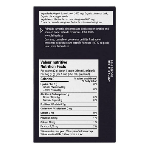 Ingredients: Organic turmeric root (1600 mg), organic cinnamon bark, organic black pepper seeds. Turmeric, cinnamon, black pepper: traded in compliance with Fairtrade standards, total 100%.
