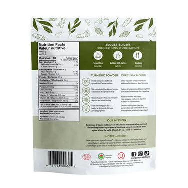 Directions: Take 1 teaspoon of Turmeric Powder once daily. Add Turmeric powder to water, coconut water, juice, smoothies, yogurt and all savory dishes. Use turmeric in all culinary preparations. Add Turmeric Powder to recipes such as salad dressings, curries, stir-frys, seafood dishes (Turmeric Glazed Wild Salmon), soups, smoothies and more. For a more concentrated form of Turmeric use Organic Traditions Turmeric Smoothie Booster™ powder which is a dual extract of supercritical CO2 and hydroethanolic extract in an easy to use, semi-soluble powder.
