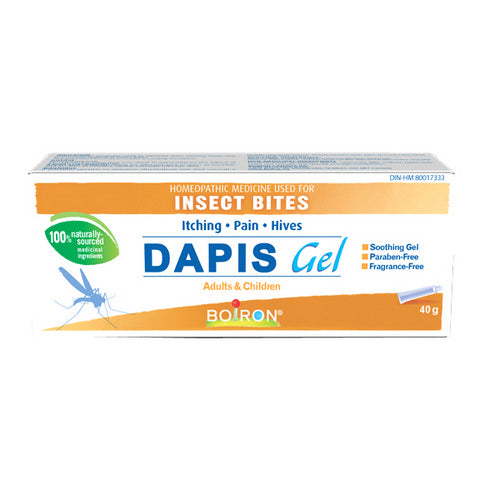 Boirons dapis gel relieves the pain, itching and swelling of skin irritations and hives. The non greasy, easy to apply gel formulation promotes fast absorption and a cooling effect. Dapis gel is effective for everyone in family.