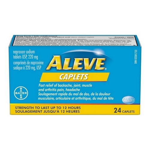 Aleve caplets contain the active ingredient naproxen sodium, which is a non-prescription pain reliever and anti-inflammatory medication. These caplets are designed to provide effective relief from a wide range of pain, such as headaches, muscle aches, arthritis, back pain, toothaches.