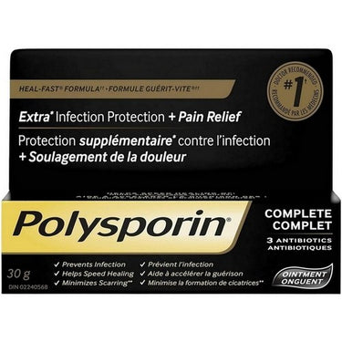 Polysporin Complete Ointment is a multi-action topical antibiotic ointment designed to provide effective wound care. It combines two antibiotics, bacitracin and polymyxin B, to help prevent infection in minor cuts, scrapes, and burns. The ointment also contains a pain-relief ingredient to alleviate discomfort at the affected area, promoting faster healing. The gentle formula is suitable for all skin types and helps to keep the wound moist, which is essential for proper recovery. Polysporin Complete Ointment is easy to apply and is an essential addition to your first aid supplies, offering comprehensive care for your minor skin injuries.