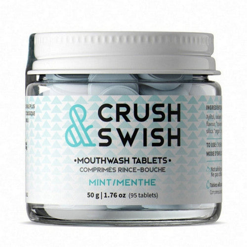 Crush and Swish Mouthwash Tablets are a unique and natural way to make mouthwash. These tablets dissolve easily in water to create a refreshing and effective mouthwash solution. Made with high-quality, natural ingredients, they promote oral health while being free from artificial preservatives and additives. Ideal for those who seek a sustainable and convenient option for their oral care routine. Perfect for travel or on-the-go use, simply crush, swish and enjoy a cleaner mouth.