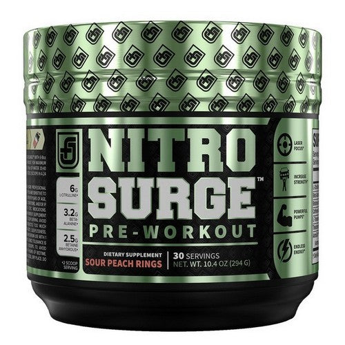Jacked Factory Nitrosurge Sour Peach Rings is a powerful pre-workout supplement designed to enhance your energy, focus, and overall performance during workouts. Formulated with a blend of ingredients to help improve blood flow and support muscle pumps, this pre-workout provides a delicious sour peach rings flavor that makes it enjoyable to consume. Whether you're getting ready for a tough workout or need a boost of energy to get through your day, Nitrosurge aims to deliver the performance benefits you need.