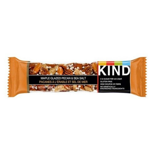 An anytime nutritious and wholesome snack kind maple glazed pecan and sea salt granola bars entice shoppers with real ingredients. Kind products are all natural, gluten free flavors with high fiber, protein.
