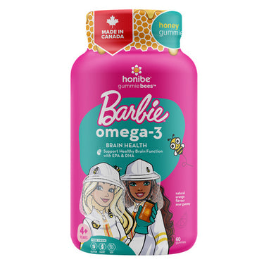 Omega-3 gummie bees from honibe are packed with EPA & DHA to support healthy brain function in a family friendly formula. Sourced from a variety of sustainable wild fish species these barbie omega-3 gummie bees deliver 100mg of combined EPA and DHA for children 4+. Natural honey is a key ingredient instead of artificial sweetener and these gummies are free from common allergens including gluten, dairy & soy. Complete with 120 mg of Omega-3 fatty acids including EPA and DHA to support your cognitive health and healthy brain function.