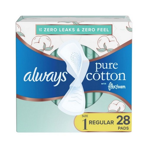 Always, Pure Cotton With FlexFoam Pads Size 1 Regular Absorbency With Wings Unscented, 28 Count
