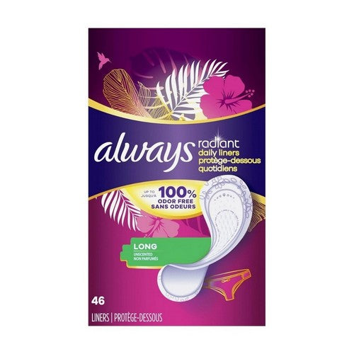 Always Radiant Daily Liners offer discreet, comfortable protection for everyday freshness. These liners are soft and flexible, designed to move with you throughout your daily activities. They're perfect for light protection, whether it's during your period or daily wear. With a floral design, they keep you feeling confident and cared for.