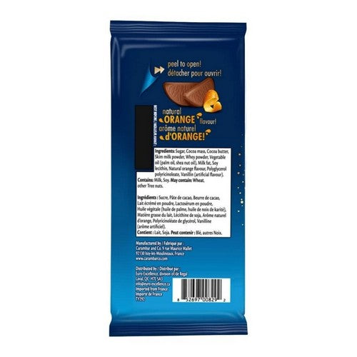 Ingredients: Sugar, Whole Milk Powder, Cocoa Butter, Cocoa Mass, Orange Flavored Oil, Emulsifier (Lecithin), Vanilla Extract, Citric Acid. |