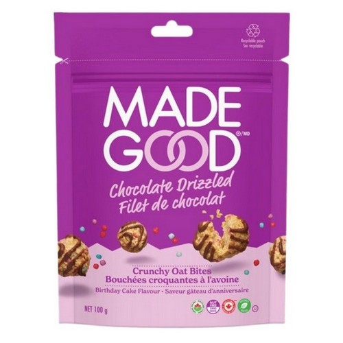 Indulge in the delightful taste of birthday cake with MadeGood's Organic Crunchy Oat Bites, featuring a delicious chocolate drizzle. These wholesome oat snacks are made with organic ingredients and are perfect for satisfying your sweet cravings while keeping your snacking guilt-free. Enjoy the perfect blend of crunch and sweetness, ideal for lunchboxes, on-the-go snacking, or as a treat any time of the day.