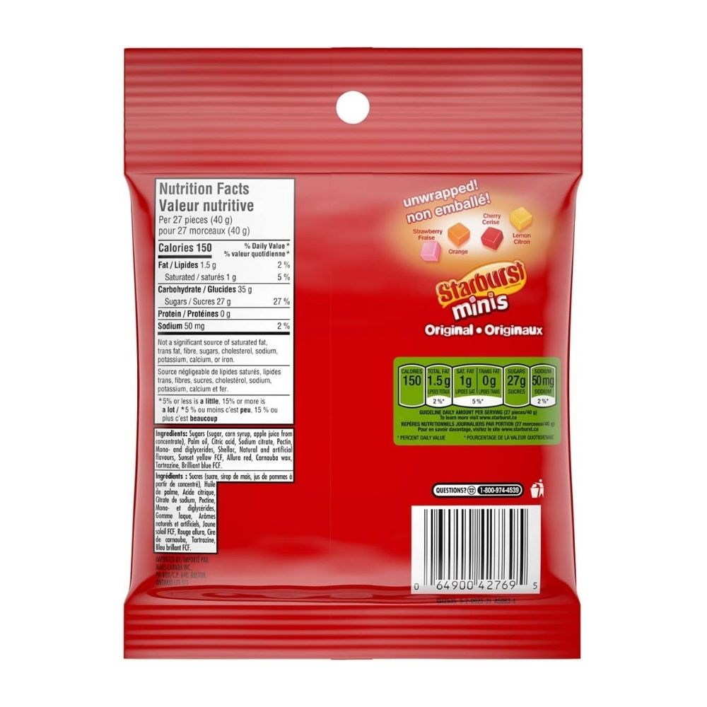 Original minis candy are bite sized versions of the classic, chewy fruit candies you love. These mini treats come in a variety of juicy flavors such as strawberry, orange, cherry, and lemon. The mini size makes them perfect for snacking, sharing, or adding to candy jars for parties. Each piece delivers the same intense, fruity flavor as the original Starburst but in a convenient, bite-sized form that makes enjoying them even easier.