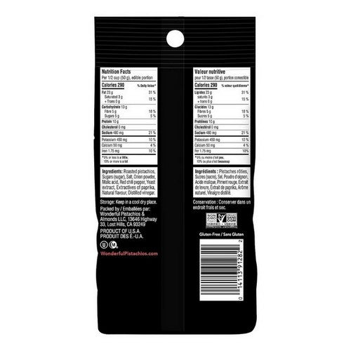 Ingredients: Roasted Pistachios, Sugar, Salt, Onion Powder, Malic Acid, Red Chili Pepper, Yeast Extract, Extractives Of Paprika, Natural Flavour, Distilled Vinegar.